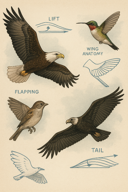 - 새의 날개는 비행기 날개와 유사하게 위쪽이 더 볼록한 형태(에어포일)를 가진다. 공기가 날개 위로 흐를 때 속도가 빨라져 압력이 낮아지고, 아래쪽 압력이 상대적으로 높아져 양력이 발생한다.